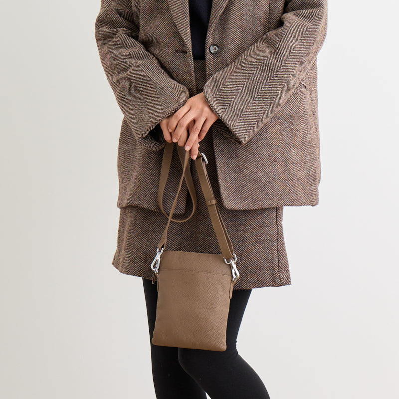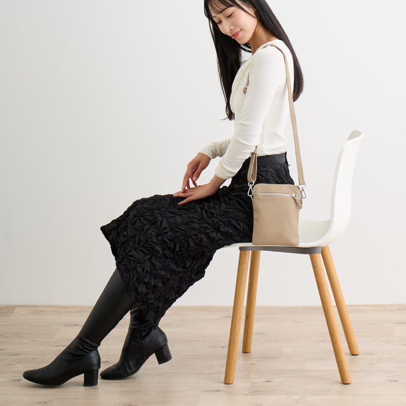 ■「牛本革の特別感」×「充実の機能性」 スマホポシェットそのものの、使い勝手の良さはそのままに、上質な牛本革で特別感を表現しました。 使うほどにあなたの手になじみ、オンリーワンのポシェットに変化していくのもリアルレザーならではの魅力。 合成皮革製とは格が違う。 手のひらサイズのラグジュアリーをぜひご体感ください。 ■「薄マチxシルバーで作る大人カジュアル」 オンオフを問わないシンプルなデザインと程よいトレンド感。 ■「ちょうどいい収納力」 スマホ、ミニ財布、キーケースなど、必要なものはしっかり収まります。 ■「3つのポケット」 サッと取り出したいものはオープンポケットに。 貴重品はファスナーポケットへ。 ■「長さ調節ができるストラップ」 約74cm~約134cmの間で調整可能。 ■「こだわりの牛本革」 引手やストラップまで耐久性に優れた牛本革を採用。 マットな質感が大人の上品さを演出。 |