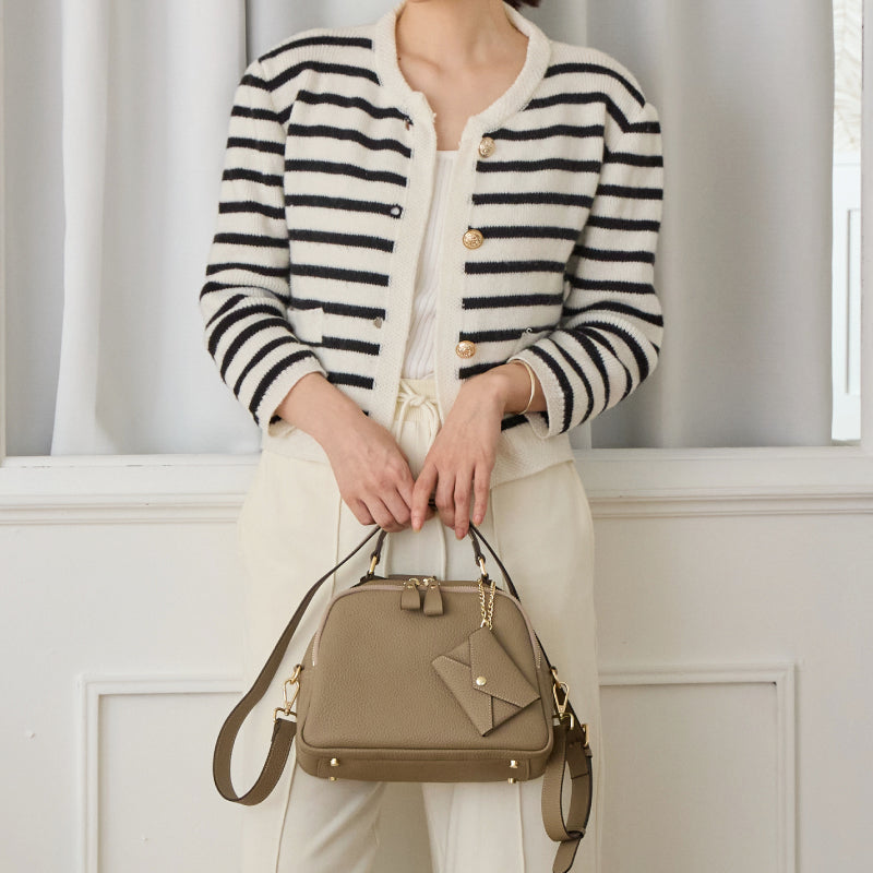 特徴 | ■2つのストラップを付け替えて、スタイルチェンジ自在。 本革製とバイカラー柄の2種類のショルダーストラップが付属。 その日の気分やコーデに合わせて、簡単に付け替え可能です。 カジュアルにもきれいめにも使えるから、シーンを選ばず活躍。 ■本革なのに、約440gと驚くほど軽やか。※ 毎日持ちたくなるって、こういうこと。 ※バッグ本体の重さ ■小さく見えて、収納力バツグン! フロント・メイン・背面の3つの収納スペースで、誰でも仕分け上手。 (1)フロントファスナーポケット (2)メイン収納 (3)背面ポケット ■フロントファスナーポケット 滑らかなファスナーでしっかり開きます。 中にはオープンポケットが付いているので、リップやアクセサリー等の小物を入れるのに便利◎ H12cm×W15cm ■メイン収納 長財布・ポーチ・500mlボトルも横向きですっきり収まる広さ。 内側には、オープンポケットとファスナーポケットを1つずつ配置。 細かいアイテムも仕分けしやすく、バッグの中で迷子になりません。 オープンポケット H11cm×W15cm ファスナーポケット H11cm×W15cm ■背面ポケット スマホや交通系ICを忍ばせて、サッと取り出し。 H12cm×W17cm ■これだけ入りました! 長財布、500mlペットボトル、ポーチ コスメ、ハンドクリーム、ハンカチ キーケース、リップ、スマホ ■バッグのワンポイントに、さりげない遊び心を。 付属の本革製レター型ミニポーチは、取り外し可能なチェーン付きで、バッグのアクセントにぴったり。 サイズ:H7cm×W9.5cm、チェーン長さ20cm ICカードやアクセサリーなど、ちょっとしたものを入れるのに◎ ■マットな質感が、上品さの秘訣。 落ち着いたツヤ感で、大人のきれいめスタイルにしっくりなじむ。 しかも、傷や汚れが目立ちにくいから、気負わず毎日の相棒に◎ ■安心の底鋲付き 置いたときの汚れや傷を防止して、バッグの底をきれいにキープ。 |