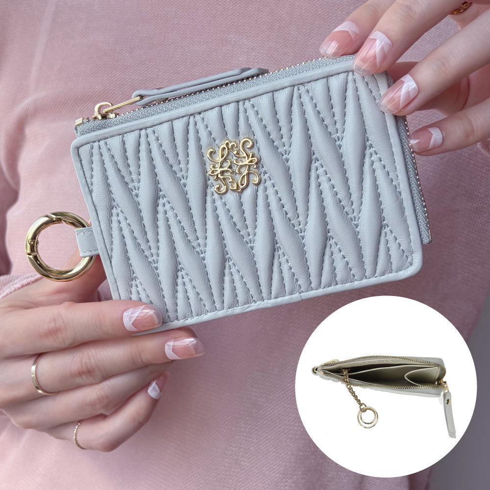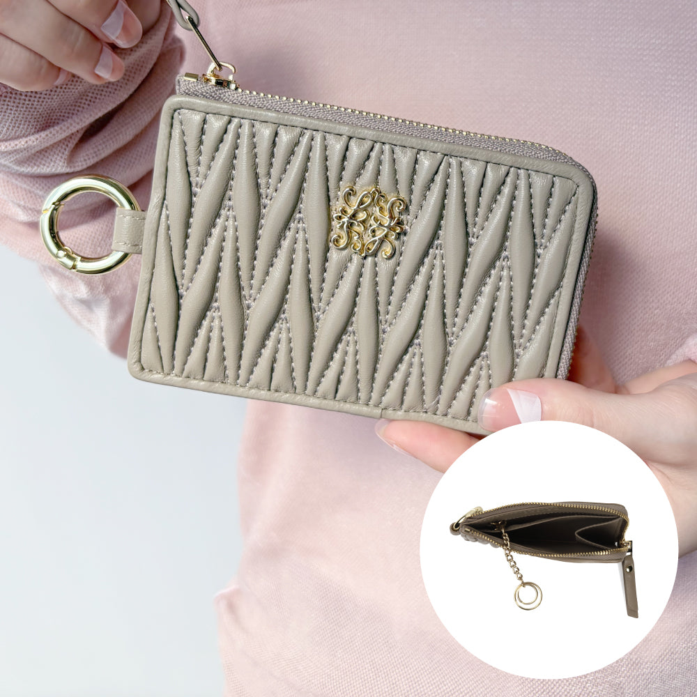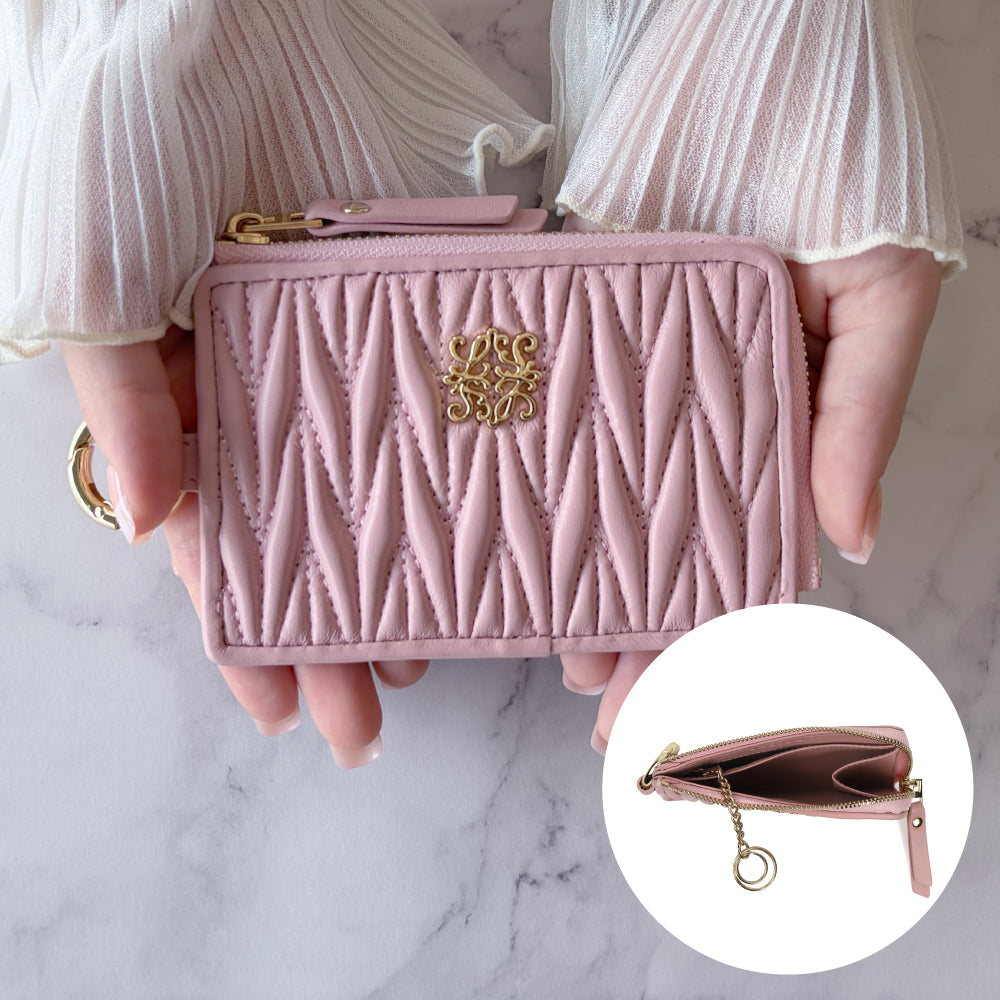 | 特徴 | ■ 世界でここでしか出会えない特注シープレザー 幾度も試作を重ね辿り着いた、指先が吸い込まれるようななめらかな上質羊革。柔らかな色合いと優美なデザインは、日常の何気ない瞬間を心ときめく特別なワンシーンへと誘います。 ■ 触れるたびに、心がほどける愛おしさ 優雅な曲線美を持つ植物をイメージしたオリジナルロゴプレートと繊細なキルティングが織りなす、この上なく愛らしいデザイン。ぷっくりと柔らかなシープレザーの質感が、小さな手の中に心地よく収まります。 ■ 必要最低限を、コンパクトに カード×5枚 小銭×15枚 お札×3枚 鍵×2個 ■ ガバっと開く、L字ファスナー フリーポケット:お札が二つ折りで収納可能 約7cmのマチ:小銭がサッと取り出せます ■ 取り外し可能なキーチェーン付き リングが2個付いているので、鍵を種類分けして整理できて便利◎ ■ 裏面はカードポケット カード3枚収納 カードが落ちないよう、しっかりとホールドする作りで安心◎ ■ フリーポケット 約幅11cmの幅広サイズ 駐車券やレシートなどの収納に便利な幅広ポケット。 ■ 改札もスマートに 外ポケットはカードキーや交通系ICカードの収納にも。いつでもピッ! ※非接触ICカードを複数入れると、干渉して読み取れない可能性があります。複数枚入れる場合は、電磁波干渉防止シートを間に挟むなどしてご使用ください。 ■ あなたなら、なに入れる? お気に入りのアクセサリー、リップやヘアゴム、イヤホンや常備薬までマルチケースとしても十分すぎる収納力◎ ■ カラーバリエーション ベビーピンク、ミストブルー、メロンソルベ、レモンイエロー、クラシックローズ、グレージュ、シルバー、ブラック |