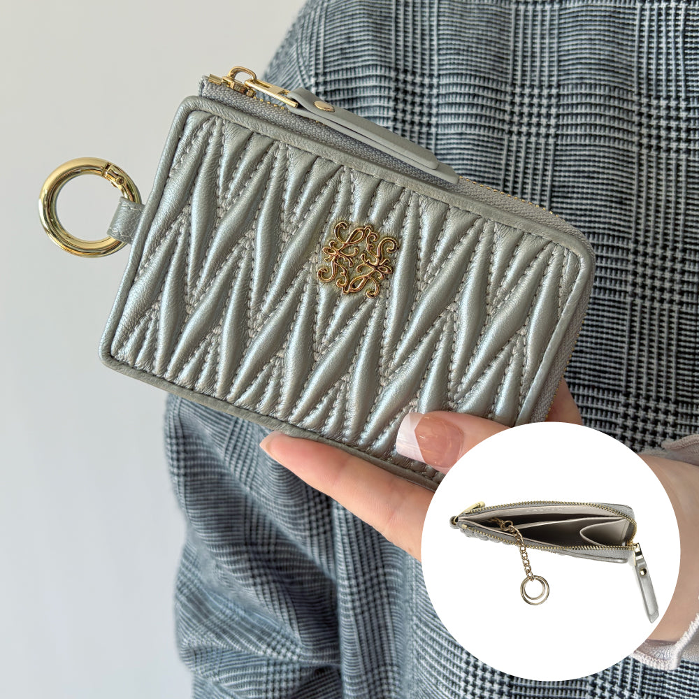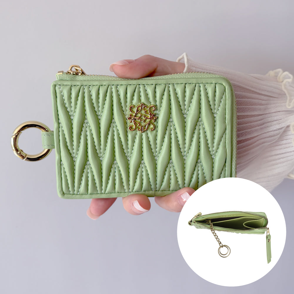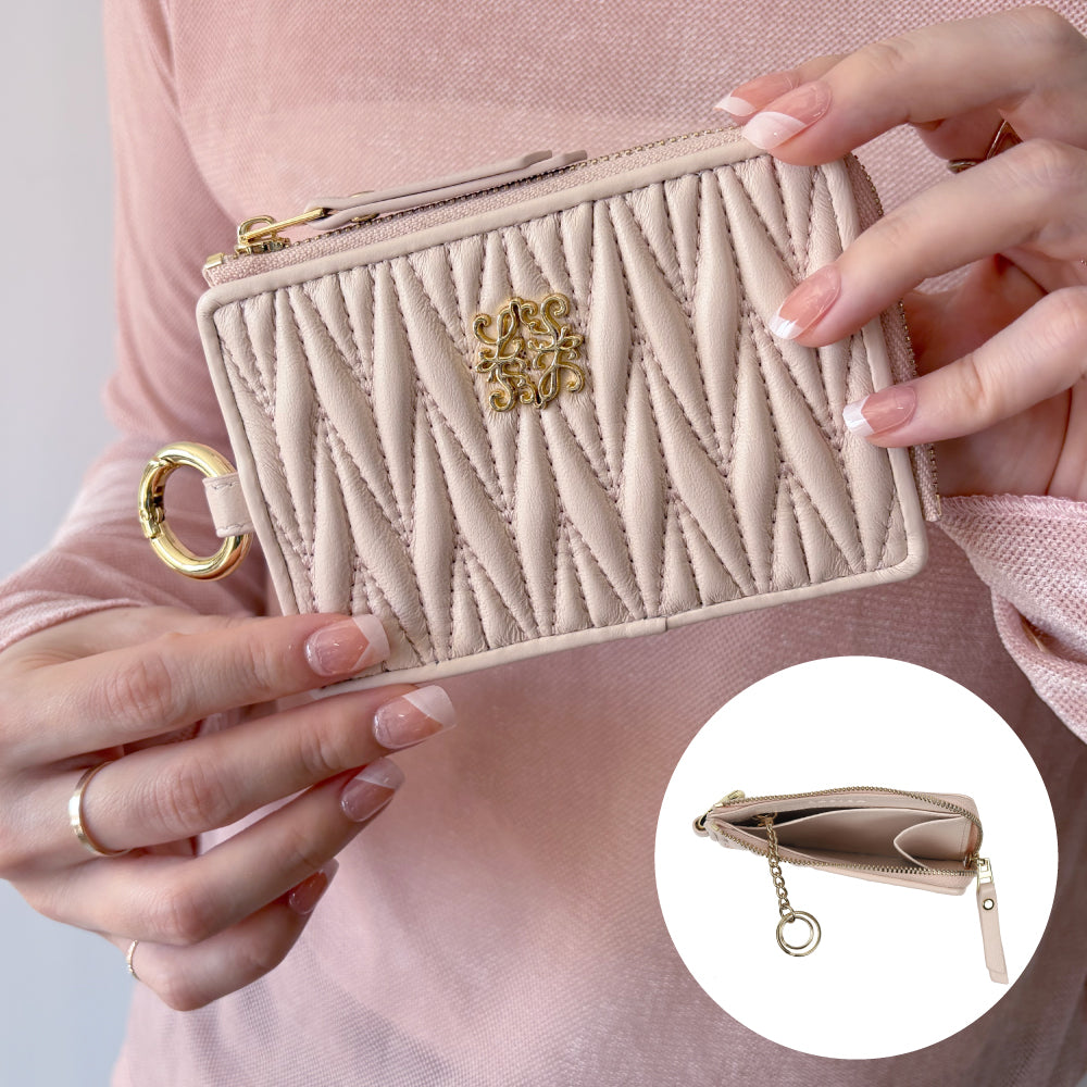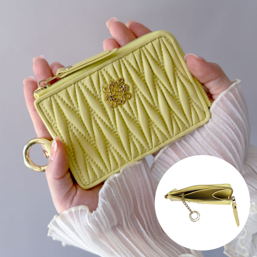 | 特徴 | ■ 世界でここでしか出会えない特注シープレザー 幾度も試作を重ね辿り着いた、指先が吸い込まれるようななめらかな上質羊革。柔らかな色合いと優美なデザインは、日常の何気ない瞬間を心ときめく特別なワンシーンへと誘います。 ■ 触れるたびに、心がほどける愛おしさ 優雅な曲線美を持つ植物をイメージしたオリジナルロゴプレートと繊細なキルティングが織りなす、この上なく愛らしいデザイン。ぷっくりと柔らかなシープレザーの質感が、小さな手の中に心地よく収まります。 ■ 必要最低限を、コンパクトに カード×5枚 小銭×15枚 お札×3枚 鍵×2個 ■ ガバっと開く、L字ファスナー フリーポケット:お札が二つ折りで収納可能 約7cmのマチ:小銭がサッと取り出せます ■ 取り外し可能なキーチェーン付き リングが2個付いているので、鍵を種類分けして整理できて便利◎ ■ 裏面はカードポケット カード3枚収納 カードが落ちないよう、しっかりとホールドする作りで安心◎ ■ フリーポケット 約幅11cmの幅広サイズ 駐車券やレシートなどの収納に便利な幅広ポケット。 ■ 改札もスマートに 外ポケットはカードキーや交通系ICカードの収納にも。いつでもピッ! ※非接触ICカードを複数入れると、干渉して読み取れない可能性があります。複数枚入れる場合は、電磁波干渉防止シートを間に挟むなどしてご使用ください。 ■ あなたなら、なに入れる? お気に入りのアクセサリー、リップやヘアゴム、イヤホンや常備薬までマルチケースとしても十分すぎる収納力◎ ■ カラーバリエーション ベビーピンク、ミストブルー、メロンソルベ、レモンイエロー、クラシックローズ、グレージュ、シルバー、ブラック |